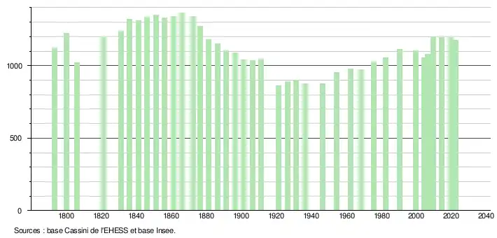 L'évolution du nombre d'habitants est connue à travers les recensements de la population effectués dans la commune depuis 1793. Pour les communes de moins de 10 000 habitants, une enquête de recensement portant sur toute la population est réalisée tous les cinq ans, les populations de référence des années intermédiaires étant quant à elles estimées par interpolation ou extrapolation[19]. Pour la commune, le premier recensement exhaustif entrant dans le cadre du nouveau dispositif a été réalisé en 2004[20].