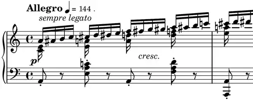 Chopin a exigé que la gamme chromatique soit jouée sempre legato, une direction mentionnée sept fois dans la partition. Cela contraste avec les accords staccato joués en accompagnement.