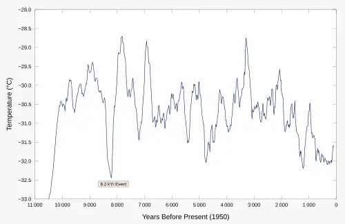 - ↑ R. B. Alley et al., « Holocene climatic instability; a prominent, widespread event 8,200 yr ago », Geology, vol. 25, no 6, , p. 483–6 (DOI 10.1130/0091-7613(1997)025<0483:HCIAPW>2.3.CO;2, Bibcode 1997Geo....25..483A, lire en ligne)