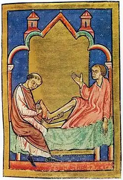 - ↑ Les illustrations de cette section proviennent du manuscrit MS Yates Thompson 26, conservé à la British Library. Il s'agit d'une copie de la vie en prose de Cuthbert rédigée par Bède le Vénérable vers 721, réalisée au prieuré de la cathédrale de Durham dans le dernier quart du XIIe siècle.