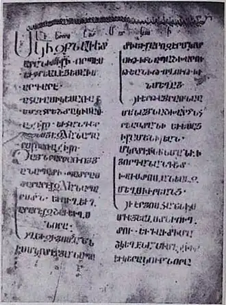 - ↑ (ru) A. Matevossian (Матевосян А.), Souvebir des manuscrits arméniens du V—XII s., Erevan., изд-во АН АрмССР, , XIV, 23 (lire en ligne)
