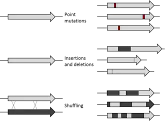 Le gène de départ peut subir la mutagénèse par des mutations ponctuelles (en utilisant des mutagènes chimiques ou la PCR sujette à erreurs)[6],[7] ainsi que par des insertions et délétions (grâce à des transposons)[8]. La recombinaison génétique peut être imitée par un remaniement de l'ADN[9],[10] de plusieurs séquences (habituellement de plus de 70% d'homologie) afin de sauter dans des régions d'espace séquentiel entre les gènes parents remaniés. Enfin, des régions spécifiques d'un gène peuvent être systématiquement randomisées (subir une mutagénèse aléatoire)[11] pour une approche plus ciblée basée sur la connaissance de la structure et de la fonction. En fonction de la méthode utilisée, la proportion de variants fonctionnels variera d'une banque à l'autre. Même si un organisme est utilisé pour exprimer un gène d'intérêt, si seulement ce gène subit une mutagénèse, le reste du génome de l'organisme restera le même et peut être ignoré pour l'expérience (dans la mesure où on garde un environnement génétique constant).
