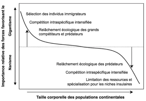 Cette évolution des tailles est principalement causée par la limitation en ressources, la diminution de la compétition interspécifique et la diminution de prédateurs. Plus une île est de petite taille et isolée du continent, plus la diversité spécifique, c’est-à-dire le nombre d’espèces et leur abondance relative, diminue. Il y a une plus grande diversité spécifique sur les surfaces les plus grandes, et donc plus d’espèces différentes sur les continents que sur les îles. Au contraire, la densité au sein de chaque espèce augmente (densité intraspécifique) sur les îles plus petites. On peut ainsi observer des densités similaires ou même plus élevées sur les îles que sur les continents. Les ressources sont moins abondantes sur une île ce qui conduit à une compétition intraspécifique (au sein d’une même espèce) pour les ressources plus intense, d’autant plus que la densité intraspécifique est aussi plus grande. Il y a donc une modification des forces de pression qui opèrent sur les îles : des interactions interspécifiques (entre différentes espèces) qu’on observe sur le continent (prédation, parasitisme, compétition) vers de la compétition intraspécifique. La diminution des pressions interspécifiques est un relâchement écologique (ecological release en anglais). Le relâchement écologique et la limitation des ressources sont les deux forces sélectives principales qui s’exercent sur populations insulaires[3].