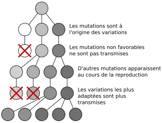 - par l'existence de divers mécanismes qui vont modifier la fréquence de certains traits héréditaires au sein de la population. Parmi ces mécanismes, la sélection naturelle désigne la différence de propagation entre les traits héréditaires causée par leur effet sur la survie et la reproduction des individus : si un certain trait héréditaire favorise les chances de survie ou la reproduction, il s'ensuit mécaniquement que la fréquence de ce trait augmente d'une génération à l'autre. Dans une population de taille finie, un trait peut également être propagé ou éliminé par le fait de fluctuations aléatoires (dérive génétique).