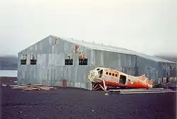 Parmi les autres ruines de la baie des Baleiniers, on trouve un vieux hangar aérien avec un fuselage d'avion orange vif devant (retiré en 2004[4]), et la base scientifique britannique, Biscoe House, dont le centre fut détruit par l'éruption de 1969.