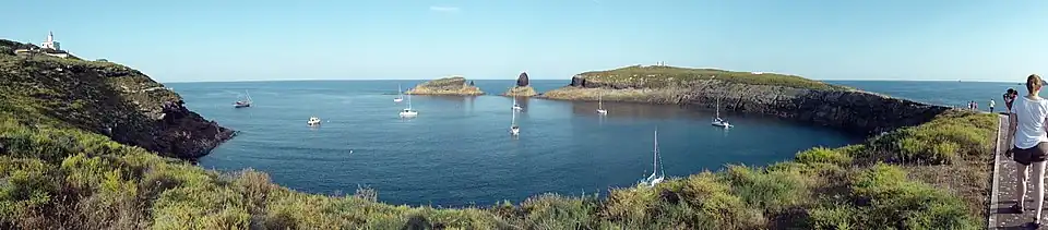 Vue panoramique de la baie de l'Illa Grossa, la plus grande des Columbretes, avec au fond les îlots de Mancolibre (à gauche) et de el Mascarat (à droite).