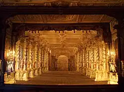 À l'intérieur, la « salle des masques » est l'une des pièces les plus représentatives des fastes d'autrefois. Cette salle de bals est ornée de peintures en trompe-l’œil réalisées par Josef Lederer en 1748, sur le thème de la commedia dell'arte.