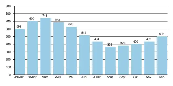 Les crues ne sont pas très importantes. Les QIX 2 et QIX 5 valent respectivement 2,9 et 4,4 m3/s. Le QIX 10 est de 5,3 m3/s, le QIX 20 de 6,3 m3/s, tandis que le QIX 50 se monte à 7,5 m3/s.