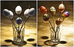 Une technique populaire de décoration des œufs de Pâques, appelée « pissanka » (en polonais: pisanka, en ukrainien : писанка), associe l'usage de la teinture et de la cire.
