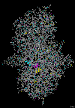 Alpha-amylase. L'aspartate 300 est en cyan, l'aspartate 197 en jaune et le glutamate 233 en jaune.