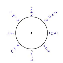 Les tableaux ci-dessous donnent la valeur de chacune des vingt-huit lettres de l'alphabet arabe[4]. À noter que ces tableaux présentent, du premier au dernier, un ordre alphabétique ancien (dit « ordre levantin ») dans lequel le classement des lettres correspond à la progression des nombres. Le classement actuel de l'alphabet arabe suit un ordre différent (voir tableau à droite), si bien que les nombres sont dans le désordre.