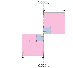 - En analyse réelle, l'analogue en base trois, 0,222… = 1, apparaît dans le fait que l'ensemble de Cantor est fermé : un point dans l'intervalle unité [0, 1] fait partie de l'ensemble de Cantor s'il peut s'écrire en base 3 en n'utilisant que les chiffres 0 et 2. On obtient donc l'ensemble de Cantor en enlevant de [0, 1] son tiers central : l'intervalle de 0,1 = 13 à 0,1222… = 23 (mais en conservant ces extrémités puisqu'elles ont une autre représentation, qui ne contient pas de 1 : par exemple, 13 = 0,0222…) puis de même, en ôtant des deux segments latéraux leur tiers central (intervalle ouvert), etc.