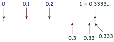 Le processus inverse est de déterminer, pour un nombre réel donné, tous les développements décimaux auxquels il correspond. Si l'on sait qu'un nombre réel x est dans le segment [0, 10] (c'est-à-dire que 0 ≤ x ≤ 10), on peut diviser cet intervalle en 10 parties égales, qui ne se recouvrent qu'à leurs extrémités : [0, 1], [1, 2], [2, 3], … , [9, 10]. Le nombre x doit appartenir à l'un de ces intervalles ; s'il appartient à [2, 3], on note le chiffre 2, et l'on subdivise l'intervalle en dix : [2,0, 2,1], [2,1, 2,2], [2,2, 2,3], … , [2,9, 3]. On note alors le séparateur décimal et le chiffre correspondant à l'intervalle où se trouve x ; en continuant ce processus, on obtient une suite infinie de segments emboîtés, que l'on repère par une suite infinie de chiffres b0,b1b2b3… et l'on écrit x = b0,b1b2b3…. Dans ce formalisme, les identités 0,999… = 1 et 1,000… = 1 reflètent respectivement que 1 est à la fois dans le segment [0, 1] et [1, 2], si bien que l'on peut choisir l'un ou l'autre de ces intervalles au début de la recherche des décimales. La suite découle de ce choix initial.