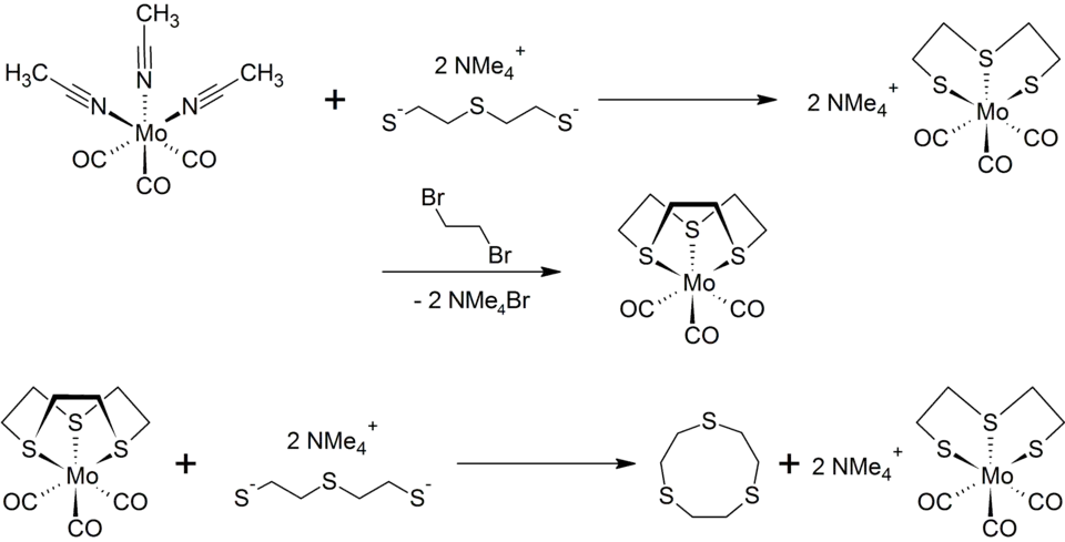 Le 9-ane-S3 a été publié pour la première fois en 1977[4]. Les procédés ultérieurs font intervenir l'assemblage dans la sphère de coordination d'un ion métallique suivi d'une décomplexation[5] :