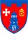 - insigne d'arme D'azur à un mur de gueule crénelé de deux pièces mouvant de la pointe et des flancs chargé d'une croix cosaque d'argent[13].