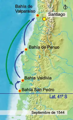 - 4-30 septembre : expédition de Juan Bautista Pastene (de) parti reconnaître la côte sud-ouest du Chili[10].