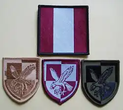 En haut: patch Drop Zone. De gauche à droite: Desert Subdued, Full Color, DPM Subdued versions of the Brigade's original Striking Eagle insignia (1999–2015)