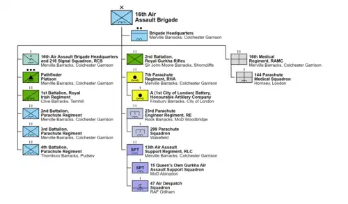 En tant que formation d'intervention rapide de l'armée britannique, la 16e Brigade d'assaut par air a servi à l'avant-garde de tous les déploiements opérationnels récents de l'armée en Sierra Leone, en Macédoine, en Irak et en Afghanistan. C'est la plus importante brigade de l'armée, avec 6 200 personnes. Elle comprend[4]: