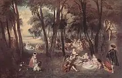 - Embarquement pour Cythère, huile sur toile d'Antoine Watteau et réplique de Le Pèlerinage à l'île de Cythère réalisée par le même auteur un an plus tôt.