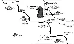 Toutefois, alors que l'opération commence à être planifiée, il apparaît très rapidement que le nombre d'appareils de transports est insuffisant pour transporter trois divisions entières. De ce fait, la 13e division est retirée de l'opération en raison de son inexpérience, la 17e division ayant déjà connu le feu lors de la bataille des Ardennes et la 6e division ayant participé à la bataille de Normandie[14]. Quoi qu'il en soit, l'opération Varsity constitue l'unique action aéroportée de la 17e division. Les deux divisions doivent être larguées derrière les lignes allemandes et reçoivent pour objectif d'atterrir autour de Wesel et de perturber les défenses adverses pour faciliter la progression de la deuxième armée britannique. Dans cette optique, les deux divisions sont larguées près de la ville d'Hamminkeln et reçoivent plusieurs missions. Elles doivent sécuriser la forêt de Diersfordter qui surplombe le Rhin et dont une route relie plusieurs villes entre elles. En outre, elles doivent s'emparer de plusieurs ponts au-dessus de la vallée du Vieil Yssel pour faciliter l'avance des Alliés. Enfin, la ville d'Hamminkelm elle-même doit être conquise[15]. Une fois ces différents buts remplis, les troupes aéroportées doivent consolider leurs positions et les défendre contre les Allemands, le temps que les troupes terrestres ne les rejoignent.