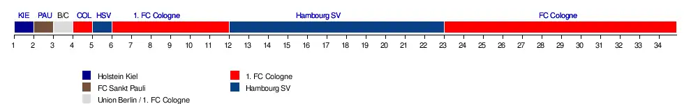 | Kiel | 1 | 2 | 7 | 4 | 8 | 9 | 12 | 9 | 11 | 11 | 10 | 11 | 10 | 9 | 6 | 5 | 5 | 5 | 5 | 5 | 6 | 7 | 5 | 5 | 5 | 5 | 7 | 5 | 5 | 6 | 7 | 7 | 6 | 6 | 1 | 0 |