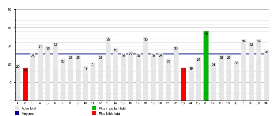 | Journée → | 1 | 2 | 3 | 4 | 5 | 6 | 7 | 8 | 9 | 10 | 11 | 12 | 13 | 14 | 15 | 16 | 17 | 18 | 19 | 20 | 21 | 22 | 23 | 24 | 25 | 26 | 27 | 28 | 29 | 30 | 31 | 32 | 33 | 34 | Journées en tête | Journées relégable |