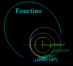 ![]() L'orbite du "fourtino" 2003 LA7 comparée à Pluto et Neptune. |