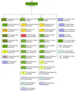 Au début de la Seconde Guerre mondiale, la force régulière de l’Armée de terre canadienne se composait des 1re et 2e Divisions d’infanterie canadienne, toutes deux mobilisées le [2]. Chacune de ces divisions était constituée de trois brigades d’infanterie, elles-mêmes composées de trois bataillons de fusiliers, un bataillon de mitrailleuses, des batteries d’artillerie divisionnaires et des unités du génie à l'appui[3].