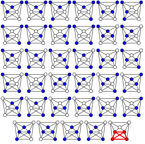 Le problème algorithmique de trouver une clique maximum dans un graphe aléatoire tiré du modèle Erdős – Rényi (dans lequel chaque arête apparaît avec une probabilité 1/2, indépendamment des autres arêtes) a été suggéré par Karp (1976). Étant donné que la clique maximum dans un graphe aléatoire a une taille logarithmique avec une probabilité élevée, elle peut souvent être trouvée par une recherche par force brute dans le temps . Il s'agit d'une limite temporelle quasi polynomiale[45]. Bien que le nombre de cliques de ces graphes soit généralement très proche de 2 log2n, des algorithmes gloutons simples ainsi que des techniques d'approximation aléatoire plus sophistiquées ne trouvent que des cliques de taille log2n, deux fois moins grandes. Le nombre de cliques maximales dans de tels graphes est avec une probabilité élevée exponentielle en log2n, ce qui empêche les méthodes qui répertorient toutes les cliques maximales de s'exécuter en temps polynomial[46]. En raison de la difficulté de ce problème, plusieurs auteurs ont étudié le problème de la clique plantée, le problème de la clique sur des graphes aléatoires qui ont été augmentés en ajoutant de grandes cliques[47]. Alors que les méthodes spectrales[48] et la programmation semi-définie[49] peuvent détecter les cliques cachées de taille , aucun algorithme en temps polynomial n'est actuellement connu pour détecter celles de taille (exprimées en utilisant la notation o)[50].