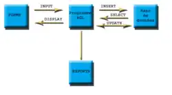Les programmes 4gl communiquent avec les formes via des instructions spéciales qui associent des groupes de variables du programme à un groupe de variables de la forme. Enfin la sortie (vers une imprimante, vers un fichier informatique, etc.) est gérée par un type spécial de fonctions, les fonctions reports.
