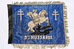 À la demande du capitaine Branet, cet escadron, devenu 3ecompagnie du 501erégiment de chars de combat, va reprendre les traditions du 5ehussards[37]. Dans un courrier du , le chef d'escadrons Branet précisait: "le , le 3e compagnie du 501e RCC reçut un fanion spécial dont une face est bleue hussard brodée d'une effigie de saint Georges terrassant le dragon"[38]