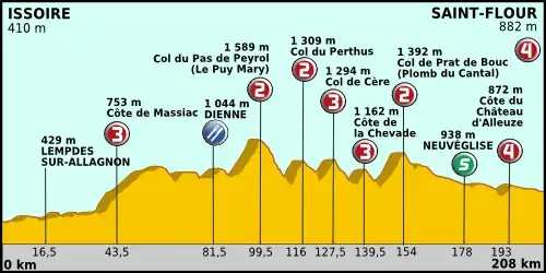 Les coureurs parcourent le Puy-de-Dôme, la Haute-Loire puis le Cantal, et franchissent trois cols de 2e catégorie : le Pas de Peyrol, plus haut col routier du Massif Central, le col du Perthus et le col de Prat de Bouc.