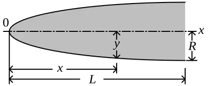 Dans toutes les équations de pointe avant qui vont suivre, L est la longueur totale de la pointe et R est le rayon de la base de la pointe. y est le rayon en tout point x, comme X varie de 0, au bout de la pointe jusqu'à L. Les équations définissent le profil de bidimensionnel de la forme de la pointe avant. La surface de révolution de la pointe est formée par la rotation du profil autour de l'axe (C / L).