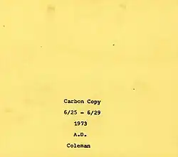 A.D. Coleman fit un bon nombre d’essais photographiques. Carbon Copy en 1973 fut l’un d’eux. Ce livre fut un test d’expérimentation sur la nouvelle technologie dans l’image. Il utilisa la machine Xerox Haloid afin de documenter son corps, son organisme en bits numériques, de texture dans une performance d’image au travers un livre d’artiste[2].