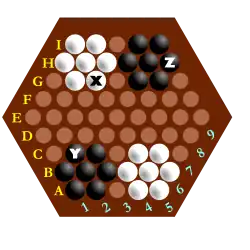 Pour noter les coups, on utilise les lettres A à I pour les lignes horizontales et les nombres 1 à 9 pour les diagonales nord-ouest/sud-est.