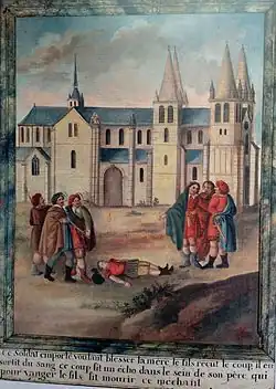 Le samedi , à la tombée de la nuit, la situation devient critique. Des hommes et des femmes, habitant Déols, se regroupent devant le portail ouest de l'église abbatiale, dont les portes sont closes. Leurs prières adressées à la Bienheureuse Vierge Marie, dont une sculpture peinte se trouve au-dessus du portail, provoquent les railleries de quelques cotereaux[22] appartenant au corps d'armée de Richard. Une pierre, jetée par l'un des soldats sur la statue de la Vierge brise le bras de l'enfant Jésus. Le bras tombe à terre et un flot de sang jaillit de la pierre mutilée ! Quant à l'auteur du sacrilège, il s'effondre sans vie sur le sol.