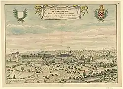 Veüe de l'Abbaye et du bourg de Fontevraut, en Anjou, et du diocesse de Poictiers, dessiné du costé de l'acudeman (sic) ou à son midy par Louis Boudan, en 1699 (aquarelle, Bibliothèque nationale de France).