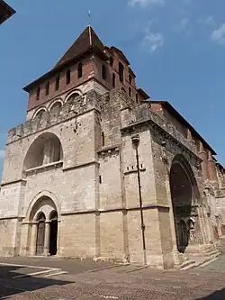 Il ne subsiste de l'édifice roman du XIIe siècle avec le cloître que le clocher-porche situé au sud de la nef qui abrite l'entrée principale et son tympan. Il se compose au rez-de-chaussée d'un narthex surmonté d'une salle haute. Le clocher-porche a été fortifié ou consolidé vers 1180 par une construction doublant le mur initial, qui comporte un chemin de ronde, un parapet crénelé, des archères et une galerie à mâchicoulis. Au-dessus, l'élévation en brique est d'époque gothique.