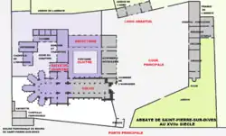 Située à l'est de la Dives, l'abbaye est close de murs. Dans l'angle nord-est, une petite église et une chapelle sont réservées au culte des paroissiens du bourg de Saint-Pierre-sur-Dives.