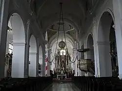 L'église abbatiale est conservée, mais raccourcie d'une travée du côté ouest (côté de la façade principale, à l'opposé du chœur : la nef n'en compte plus que six au lieu des sept de l'abbaye romane. Elle est également plus basse : l'ancienne église était dominée par un simple plafond plat en bois ; la rangée supérieure de fenêtres, qui éclairait naguère la partie haute de l'abbatiale, est aujourd'hui située au-dessus de voûtes baroques[3].