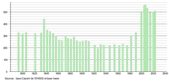 L'évolution du nombre d'habitants est connue à travers les recensements de la population effectués dans la commune depuis 1793. Pour les communes de moins de 10 000 habitants, une enquête de recensement portant sur toute la population est réalisée tous les cinq ans, les populations de référence des années intermédiaires étant quant à elles estimées par interpolation ou extrapolation[26]. Pour la commune, le premier recensement exhaustif entrant dans le cadre du nouveau dispositif a été réalisé en 2004[27].