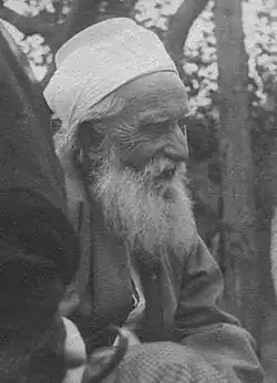 J'ai rarement vu quelqu'un dont l'apparence m'a autant impressionné. Un homme grand et fortement bâti, se tenant droit comme une flèche, avec un turban et un vêtement blancs, de longues mèches noires tombant presque jusqu'à l'épaule, un large front puissant indiquant une forte intelligence combinée à une volonté inébranlable, des yeux perçants comme ceux d'un faucon, et des traits fortement marqués mais agréables – telle fut ma première impression de 'Abbás Efendí, "le maître"[107].