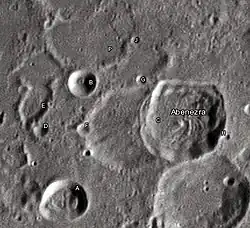 Les cratères dits satellites sont de petits cratères situés à proximité du cratère principal, ils sont nommés du même nom mais accompagné d'une lettre majuscule complémentaire (même si la formation de ces cratères est indépendante de la formation du cratère principal). Par convention, ces caractéristiques sont indiquées sur les cartes lunaires en plaçant la lettre sur le point le plus proche du cratère principal. Liste des cratères satellites de Abenezra [6] :