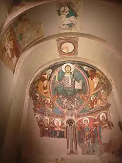 - Registre supérieur : représente le « Ciel », le Pantocrator trône à l'intérieur d'une mandorle, les pieds sur la boule du monde et sa main droite qui bénit avec deux doigts à la manière grecque ; dans sa main gauche, il porte un livre ouvert avec l'inscription EGO SUM LUX MUNDI (Je suis la lumière du monde). Son visage allongé au regard pénétrant est réalisé avec des lignes marquées, des sourcils arqués, des yeux, une bouche, une barbe et une coupe de cheveux symétrique. La couleur est appliquée avec de la peinture mate, mais avec deux tons, un clair et un plus foncé pour réaliser un certain modèle, que le peintre met en valeur dans les larges plis des vêtements. Le tétramorphe est représenté par des anges portant les symboles des évangélistes : saint Matthieu, l'ange ou l'homme ; Saint Marc, le lion ; Saint Jean, l'aigle ; Saint Luc, le taureau ; et deux personnages symétriques encadrant la composition représentant un séraphin et un chérubin possédant chacun trois paires d'ailes[22]. Le bassin de l'abside présente un fond divisé en trois bandes de couleurs différentes, noir, ocre et bleu[23].