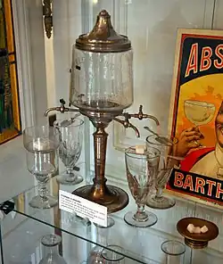 Avec l'accroissement de la popularité de la boisson au XIXe siècle, l'usage de la fontaine à absinthe se répandit. Cette fontaine particulière permet de verser l'eau au goutte à goutte sans avoir à le faire à la carafe, ainsi que de servir un grand nombre de verres à la fois.