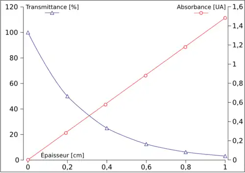 Supposons qu'une substance, d'un centimètre d'épaisseur permet à 50 % de l'énergie reçue de la traverser. Autrement dit, sa transmittance vaut 0,5. Si cette lumière obtenue passe par une deuxième couche de même épaisseur, une nouvelle fois seuls 50 % de celle-ci réussiront à passer à travers. Au passage successif par les deux couches, seulement 25 % de l'énergie de la lumière incidente ont été transmis par 2 cm de cette substance (0,5 x 0,5 = 0,52 = 0,25). De même, 3 cm transmettront 12,5 % du total reçu (0,5 x 0,5 x 0,5 = 0,53 = 0,125). Il s'agit donc là d'une progression géométrique : la transmittance ne diminue donc pas d'une manière linéaire quand l'épaisseur augmente, mais exponentielle (voir figure). En conséquence, le logarithme de T (log T) diminue linéairement en fonction de l'épaisseur[a].