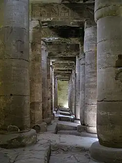 Le temple funéraire de Séthi Ier, aussi connu sous le nom actuel de « grand temple d'Abydos », est construit à un kilomètre au sud du Kom es-Sultan, en bordure du village moderne d’El-Araba el-Madfouna. Son nom égyptien est « auguste temple des millions d'années du roi de Haute et Basse-Égypte, Menmâatrê »[39]. Ce temple est l'édifice daté du Nouvel Empire le mieux préservé à Abydos. C'est aussi celui le mieux connu du grand public. Sa spécificité, unique dans l'Égypte ancienne, est son plan en « L » inversé. Les deux cours, les deux salles hypostyles et la plupart des sanctuaires (sept chapelles) se succèdent selon un axe nord-est/sud-ouest, tandis que les salles consacrées aux barques et à la préparation des offrandes s'organisent dans une aile édifiée au sud-est du temple[40]. Les sept sanctuaires sont voués aux cultes de Séthi Ier, Ptah, Rê-Horakhty, Amon-Rê, Osiris, Isis et Horus. Le premier sanctuaire, dédié au roi lui-même, célèbre sa déification en tant que souverain mort ayant atteint l'éternité.