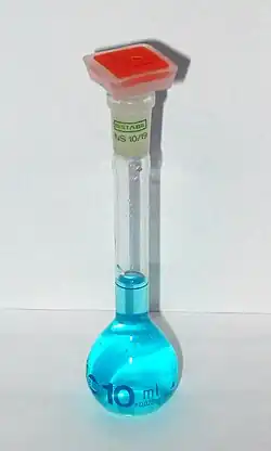 - ↑ La solution aqueuse diluée est évidemment bleue, du fait de la présence d'ions cuivriques Cu2+ solvatés par l'eau.