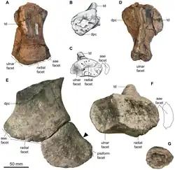 Le coracoïde est grossièrement hexagonal, contrastant avec la forme arrondie de celui de Platypterygius, bien que ses bords externes et médians sont droits et parallèles. Les surfaces supérieure et inférieure sont légèrement en forme de pagaie, et la surface médiane est en forme d'œil comme chez Ophthalmosaurus, bien qu'elle ne soit pas aussi épaisse que celles de Sveltonectes et P. australis. La surface médiane est incomplète et présente de profondes piqûres, indiquant la présence d'une épaisse couche de cartilage. À l'avant, le bord médian est fortement dévié vers l'extérieur, formant le bord rugueux d'un large processus en forme de feuillet similaire à celui d’Ophthalmosaurus. Ce processus est séparé de la facette scapulaire (articulation avec l'omoplate) par une encoche large et profonde, comme chez de nombreux spécimens d’Ophthalmosaurus. La facette scapulaire du coracoïde est petite, profondément creusée et triangulaire, tandis que la facette glénoïde (s'articulant avec l'humérus) est large et en forme d'œil. Ces facettes ne sont pas nettement séparées, contrairement à celles des Sveltonectes, où elles forment un angle de 100°. Le bord postérieur de la coracoïde est en forme de feuille et dépourvu d'encoche[3].