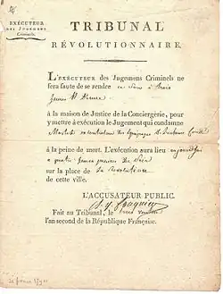 C'est par le décret du qu'est créé le tribunal révolutionnaire et la nomination d'un accusateur public ainsi que de ses deux substituts auprès de ce tribunal. Louis-Joseph Faure est le premier accusateur public nommé, mais il préfère renoncer à ce poste, c'est Fouquier-Tinville qui le remplace.